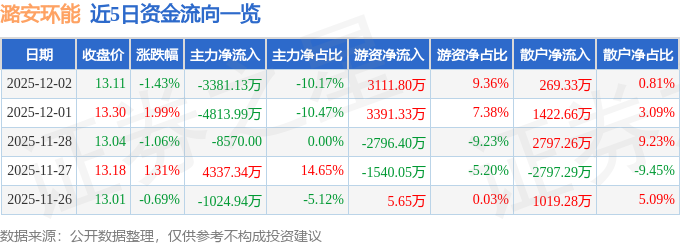 证券之星消息,截至2025年12月2日收盘,潞安环能(601699)报收于13.11元,下跌1.43%,换手率0.85%,成交量25.43万手,成交额3.33亿元。