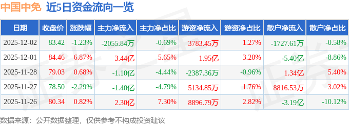 证券之星消息,截至2025年12月2日收盘,中国中免(601888)报收于83.42元,下跌1.23%,换手率1.83%,成交量35.68万手,成交额29.71亿元。