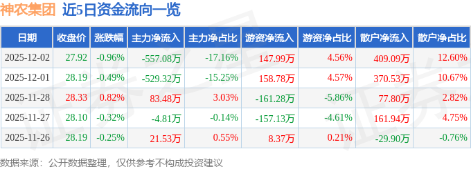 证券之星消息,截至2025年12月2日收盘,神农集团(605296)报收于27.92元,下跌0.96%,换手率0.22%,成交量1.16万手,成交额3245.83万元。