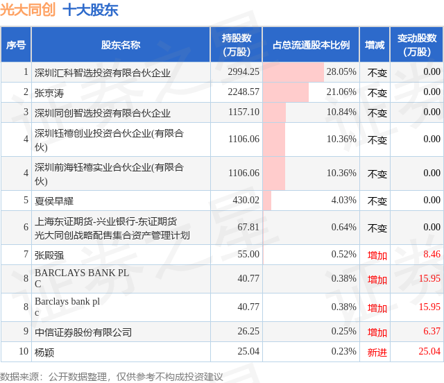 根据光大同创2025年三季报公布的十大股东详情如下: