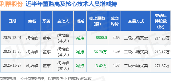 证券之星消息,根据12月2日市场公开信息、上市公司公告及交易所披露数据整理,利群股份(601366)最新董监高及相关人员股份变动情况:2025年12月1日公司董事胡培峰共减持公司股份8800.0股,占公司总股本为0.001%。变动期间公司股价下跌0.22%,12月1日当日收盘报4.63元。