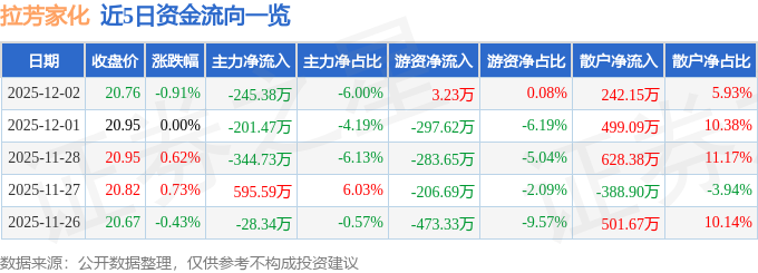 证券之星消息,截至2025年12月2日收盘,拉芳家化(603630)报收于20.76元,下跌0.91%,换手率0.87%,成交量1.97万手,成交额4086.53万元。