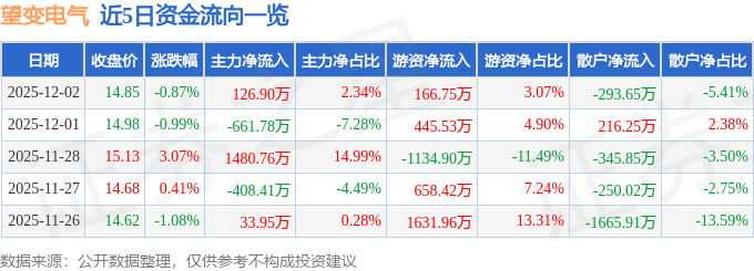 证券之星消息,截至2025年12月2日收盘,望变电气(603191)报收于14.85元,下跌0.87%,换手率1.11%,成交量3.65万手,成交额5426.47万元。