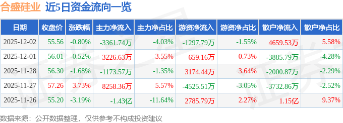 证券之星消息,截至2025年12月2日收盘,合盛硅业(603260)报收于55.56元,下跌0.8%,换手率1.28%,成交量15.18万手,成交额8.35亿元。