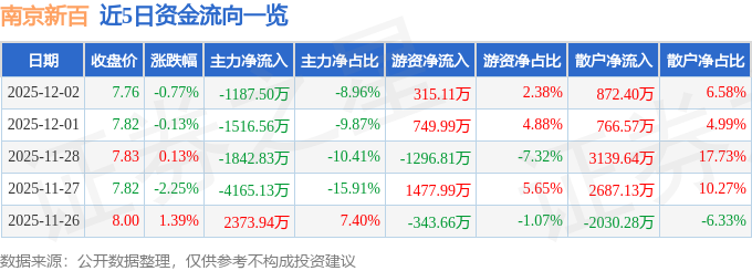 证券之星消息,截至2025年12月2日收盘,南京新百(600682)报收于7.76元,下跌0.77%,换手率1.47%,成交量17.08万手,成交额1.33亿元。