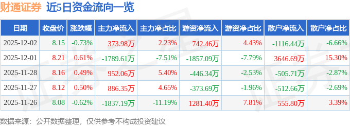 证券之星消息,截至2025年12月2日收盘,财通证券(601108)报收于8.15元,下跌0.73%,换手率0.44%,成交量20.58万手,成交额1.68亿元。