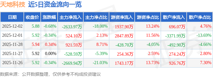 证券之星消息,截至2025年12月2日收盘,天地科技(600582)报收于5.88元,下跌0.68%,换手率0.6%,成交量24.85万手,成交额1.46亿元。