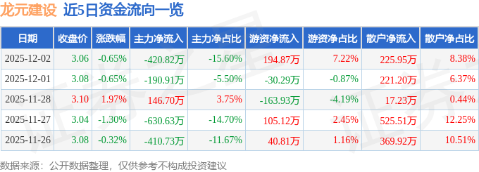 12月2日的资金流向数据方面,主力资金净流出420.82万元,占总成交额15.6%,游资资金净流入194.87万元,占总成交额7.22%,散户资金净流入225.95万元,占总成交额8.38%。