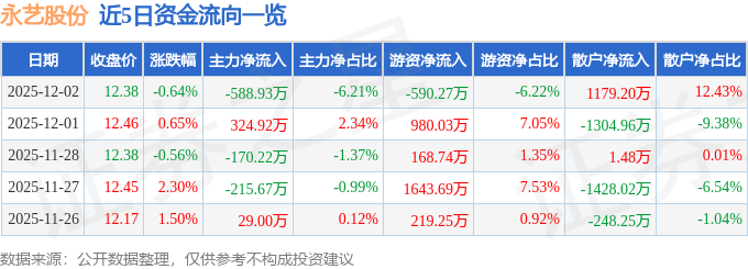 12月2日的资金流向数据方面,主力资金净流出588.93万元,占总成交额6.21%,游资资金净流出590.27万元,占总成交额6.22%,散户资金净流入1179.2万元,占总成交额12.43%。