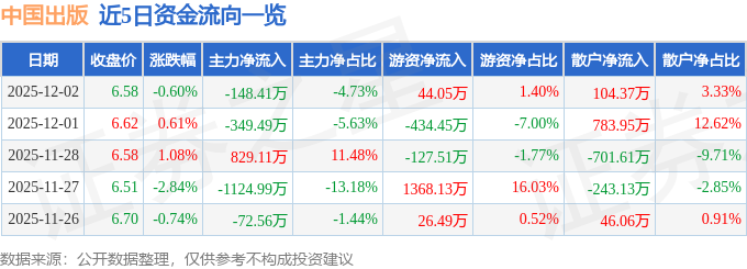 证券之星消息,截至2025年12月2日收盘,中国出版(601949)报收于6.58元,下跌0.6%,换手率0.25%,成交量4.77万手,成交额3138.75万元。