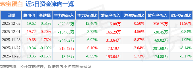证券之星消息,截至2025年12月2日收盘,索宝蛋白(603231)报收于19.62元,下跌0.51%,换手率1.44%,成交量1.53万手,成交额2995.18万元。