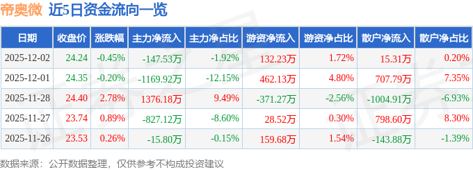 证券之星消息,截至2025年12月2日收盘,帝奥微(688381)报收于24.24元,下跌0.45%,换手率1.64%,成交量3.15万手,成交额7690.0万元。