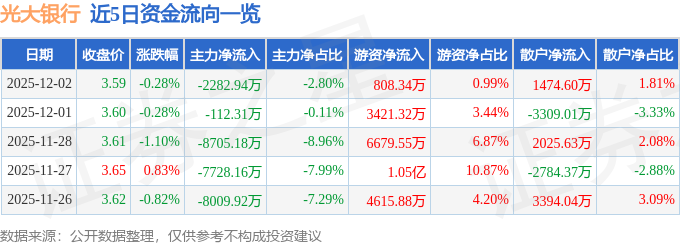 证券之星消息,截至2025年12月2日收盘,光大银行(601818)报收于3.59元,下跌0.28%,换手率0.49%,成交量227.32万手,成交额8.15亿元。