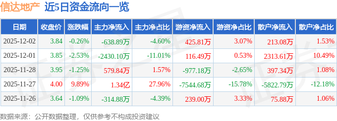 证券之星消息,截至2025年12月2日收盘,信达地产(600657)报收于3.84元,下跌0.26%,换手率1.27%,成交量36.21万手,成交额1.39亿元。
