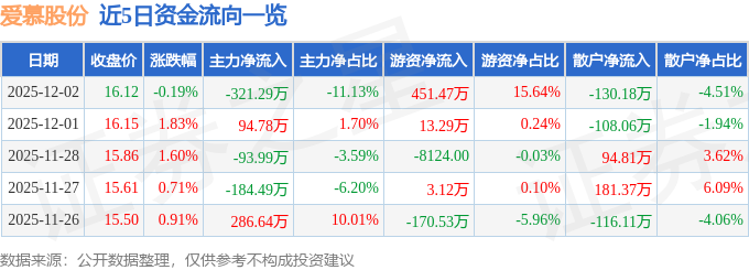 证券之星消息,截至2025年12月2日收盘,爱慕股份(603511)报收于16.12元,下跌0.19%,换手率0.45%,成交量1.79万手,成交额2886.28万元。
