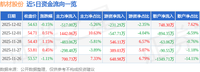 证券之星消息,截至2025年12月2日收盘,航材股份(688563)报收于54.63元,下跌0.15%,换手率1.54%,成交量1.8万手,成交额9821.84万元。