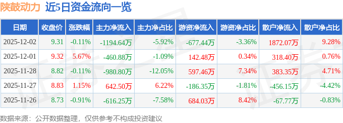 证券之星消息,截至2025年12月2日收盘,陕鼓动力(601369)报收于9.31元,下跌0.11%,换手率1.27%,成交量21.7万手,成交额2.02亿元。