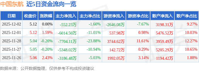 证券之星消息,截至2025年12月2日收盘,中国东航(600115)报收于5.12元,上涨0.0%,换手率0.4%,成交量67.41万手,成交额3.45亿元。