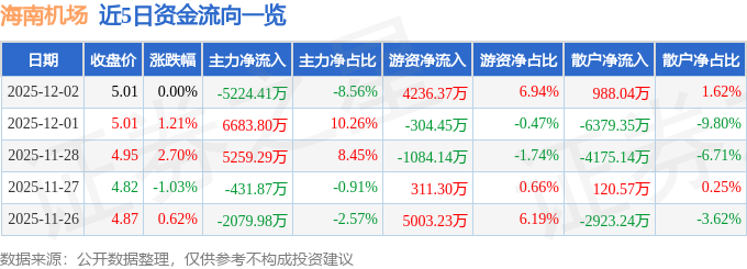证券之星消息,截至2025年12月2日收盘,海南机场(600515)报收于5.01元,上涨0.0%,换手率1.35%,成交量123.54万手,成交额6.11亿元。