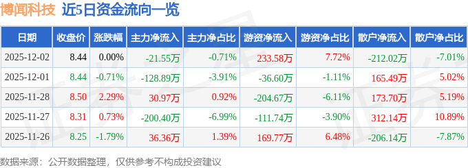 12月2日的资金流向数据方面,主力资金净流出21.55万元,占总成交额0.71%,游资资金净流入233.58万元,占总成交额7.72%,散户资金净流出212.02万元,占总成交额7.01%。