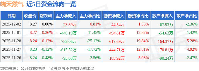 证券之星消息,截至2025年12月2日收盘,皖天然气(603689)报收于8.27元,上涨0.0%,换手率0.67%,成交量3.49万手,成交额2878.62万元。