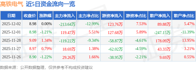 证券之星消息,截至2025年12月2日收盘,高铁电气(688285)报收于8.98元,上涨0.0%,换手率0.49%,成交量1.84万手,成交额1644.42万元。