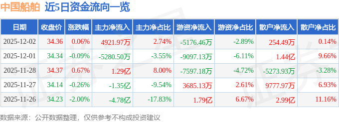 证券之星消息,截至2025年12月2日收盘,中国船舶(600150)报收于34.36元,上涨0.06%,换手率0.69%,成交量52.05万手,成交额17.93亿元。