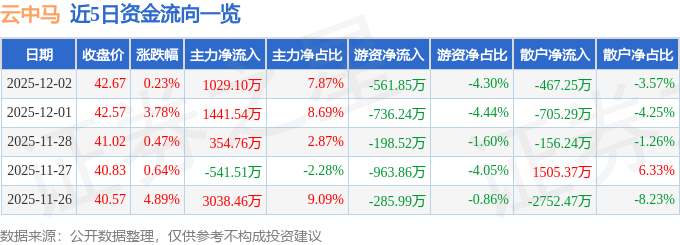 证券之星消息,截至2025年12月2日收盘,云中马(603130)报收于42.67元,上涨0.23%,换手率2.21%,成交量3.04万手,成交额1.31亿元。
