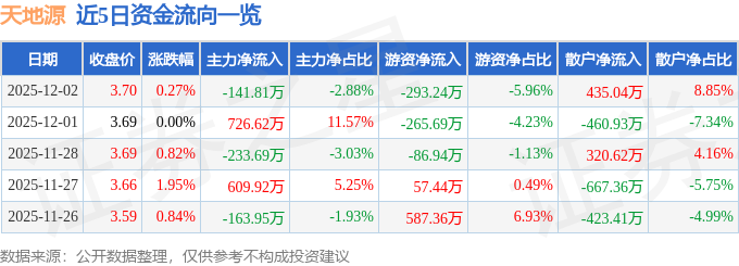 证券之星消息,截至2025年12月2日收盘,天地源(600665)报收于3.7元,上涨0.27%,换手率1.55%,成交量13.4万手,成交额4918.07万元。