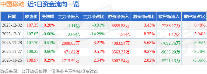 证券之星消息,截至2025年12月2日收盘,中国移动(600941)报收于107.35元,上涨0.28%,换手率1.16%,成交量10.48万手,成交额11.24亿元。