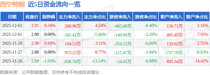 证券之星消息,截至2025年12月2日收盘,西宁特钢(600117)报收于2.91元,上涨0.34%,换手率0.67%,成交量21.93万手,成交额6342.96万元。