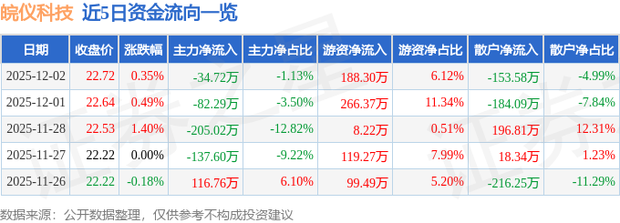 证券之星消息,截至2025年12月2日收盘,皖仪科技(688600)报收于22.72元,上涨0.35%,换手率1.01%,成交量1.36万手,成交额3075.45万元。