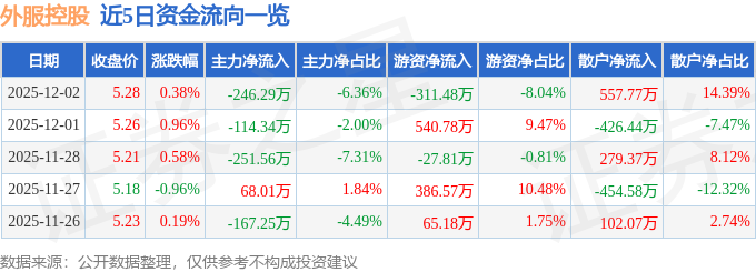 证券之星消息,截至2025年12月2日收盘,外服控股(600662)报收于5.28元,上涨0.38%,换手率0.32%,成交量7.36万手,成交额3875.21万元。