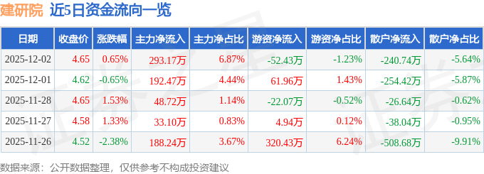 证券之星消息,截至2025年12月2日收盘,建研院(603183)报收于4.65元,上涨0.65%,换手率1.86%,成交量9.27万手,成交额4267.82万元。