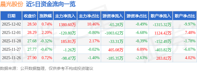 证券之星消息,截至2025年12月2日收盘,晨光股份(603899)报收于28.5元,上涨0.74%,换手率0.5%,成交量4.63万手,成交额1.32亿元。