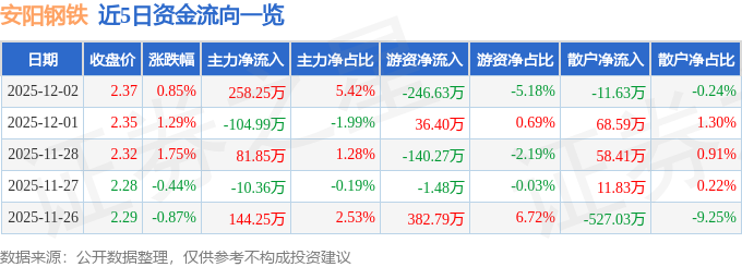 证券之星消息,截至2025年12月2日收盘,安阳钢铁(600569)报收于2.37元,上涨0.85%,换手率0.71%,成交量20.34万手,成交额4764.98万元。