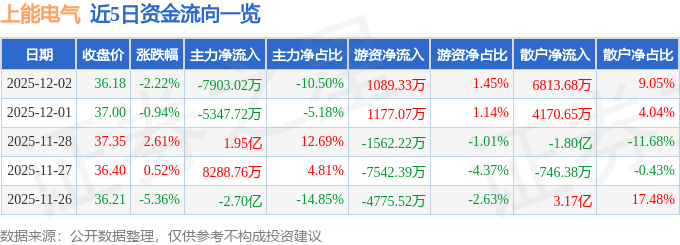 证券之星消息,截至2025年12月2日收盘,上能电气(300827)报收于36.18元,下跌2.22%,换手率5.36%,成交量20.65万手,成交额7.53亿元。