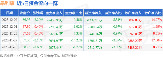 证券之星消息,截至2025年12月2日收盘,昂利康(002940)报收于36.97元,下跌2.2%,换手率3.78%,成交量7.01万手,成交额2.6亿元。