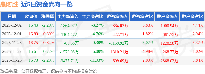 12月2日的资金流向数据方面,主力资金净流出1864.97万元,占总成交额8.27%,游资资金净流入864.03万元,占总成交额3.83%,散户资金净流入1000.94万元,占总成交额4.44%。