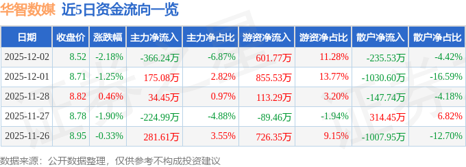 证券之星消息,截至2025年12月2日收盘,华智数媒(300426)报收于8.52元,下跌2.18%,换手率1.56%,成交量6.25万手,成交额5333.99万元。