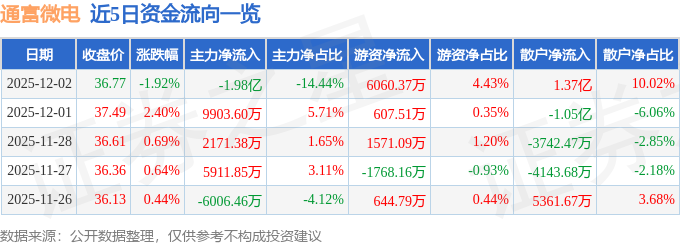 证券之星消息,截至2025年12月2日收盘,通富微电(002156)报收于36.77元,下跌1.92%,换手率2.45%,成交量37.18万手,成交额13.69亿元。