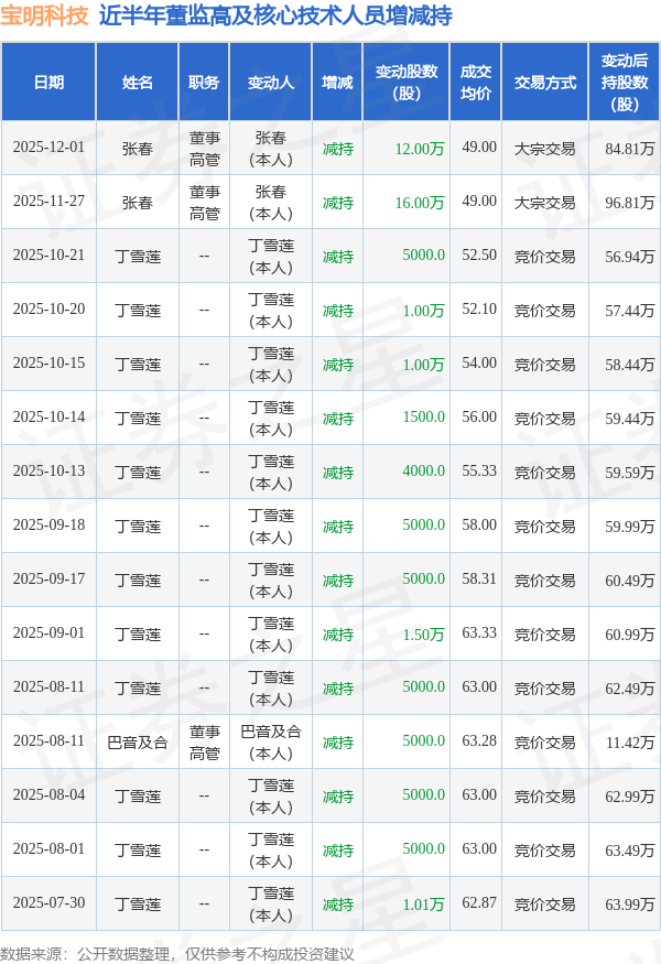 宝明科技近半年内的董监高及核心技术人员增减持详情如下:
