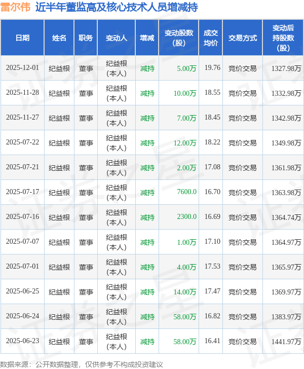 雷尔伟近半年内的董监高及核心技术人员增减持详情如下: