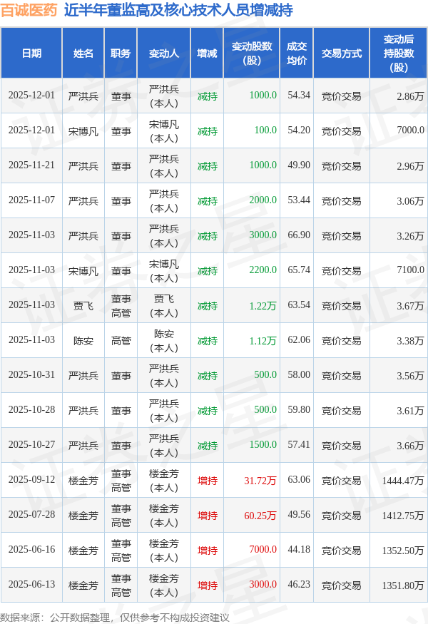 百诚医药近半年内的董监高及核心技术人员增减持详情如下:
