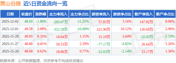 证券之星消息,截至2025年12月2日收盘,黄山谷捷(301581)报收于48.69元,下跌1.8%,换手率1.87%,成交量3735.0手,成交额1828.93万元。