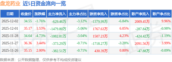 证券之星消息,截至2025年12月2日收盘,盘龙药业(002864)报收于34.55元,下跌1.76%,换手率7.84%,成交量5.82万手,成交额2.02亿元。