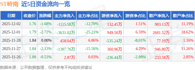 证券之星消息,截至2025年12月2日收盘,ST岭南(002717)报收于1.76元,下跌1.68%,换手率3.07%,成交量49.65万手,成交额8783.35万元。