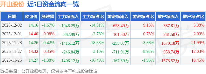 证券之星消息,截至2025年12月2日收盘,开山股份(300257)报收于14.16元,下跌1.67%,换手率0.53%,成交量5.08万手,成交额7212.82万元。