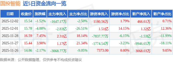 证券之星消息,截至2025年12月2日收盘,国投智能(300188)报收于15.54元,下跌1.52%,换手率4.97%,成交量42.55万手,成交额6.58亿元。
