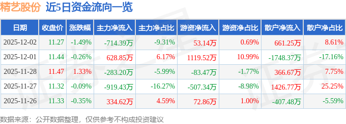 证券之星消息,截至2025年12月2日收盘,精艺股份(002295)报收于11.27元,下跌1.49%,换手率2.73%,成交量6.83万手,成交额7675.75万元。